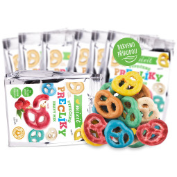 Křupavé preclíky ponořené v čokoládě s přírodními barvami.