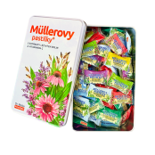 Balení v plechové dóze obsahuje směs Müllerových pastilek:islandský lišejník šalvěj jitrocel s mateřídouškou echinacea zázvor olej čajovníku australského a kajeputový olej Müllerovy pastilky lze kombinovat s Müllerovými sirupy.