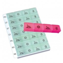 Dávkovače na léky slouží k přehlednému a spolehlivému dávkování léků či potravinových doplňků doma i na cestách. Jsou označeny jednoduchými popisky či symboly zobrazujícími denní dobu. Jednotlivé typy dávkovačů se liší velikostí, tvarem, počtem částí v jednom dni a barevným provedením. Některé kazety na léky mají hmatové znakové odlišení pro zrakově postižené. Typ 04 - týdenní dávkovač: Velikost dávkovače: 175 × 125 × 20 mm (d × š × v). Kazeta na léky pro celý týden. Každý jednotlivý den je rozdělen na 4 části RÁNO/POLEDNE/VEČER/NOC a lze ho vyjmout a používat samostatně jako DENNÍ DÁVKOVAČ. Každá část dne se otevírá samostatně pomocí víčka. Typ 04 - denní dávkovač: Velikost dávkovače: 110×22×20 mm (dך×v). Dávkovač na léky na 1 den. Den je rozdělen pomocí symbolů na 4 části RÁNO / POLEDNE / VEČER / NOC. Každá část dne se otevírá samostatně pomocí víčka, zatímco ostatní části zůstávají pečlivě uzavřeny.