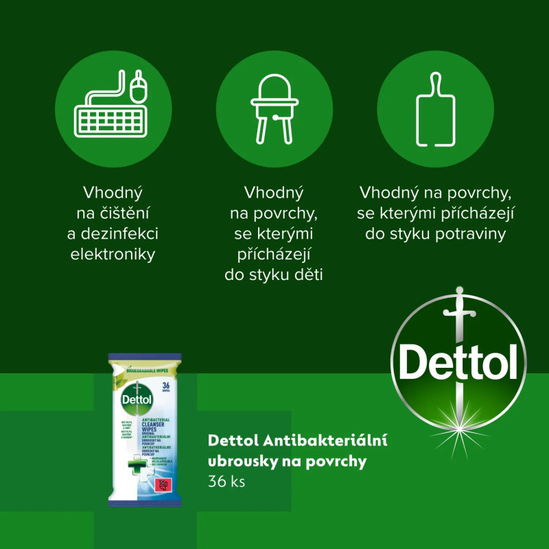 Dettol antibakteriální ubrousky, jsou efektivním a snadným řešením při potřebě dezinfekce povrchů, díky svému praktickému balení je lze využít i na cestách. Ničí 99,9 % bakterii a virů. V balení 36 kusů.