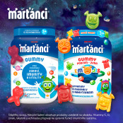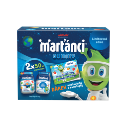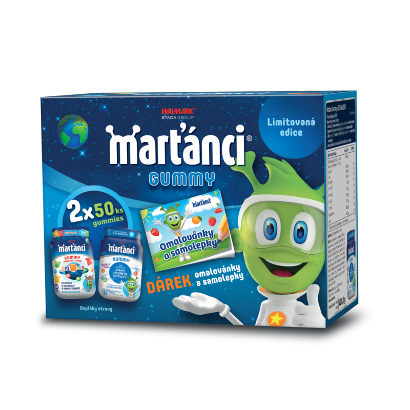 Limitovaná edice Marťánci Gummy 50+50 ks obsahuje dva nejoblíbenější marťanské multivitaminy - Marťánci Gummy s echinaceou a Marťánci Gummy PODZIM-ZIMA Emojis + dárek marťanské omalovánky se samolepkami. Hravé tvary želatinek a lahodné ovocné příchutě si vaše děti určitě zamilují.
