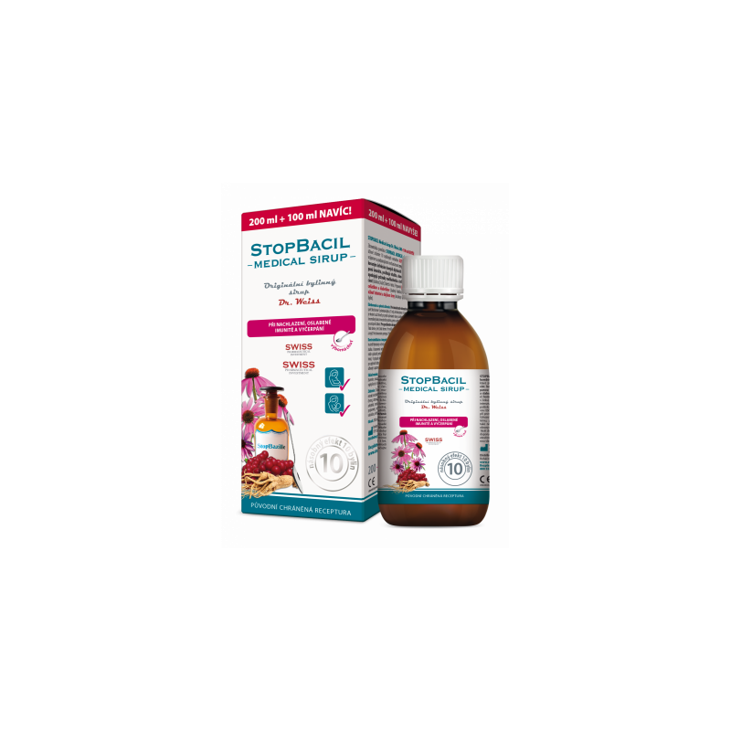 STOPBACIL Medical sirup je vhodný pro alergiky, celiaky a diabetiky (slazen fruktózou a sukralózou), mohou jej užívat těhotné a kojící ženy (obsahuje výběr šetrných a bezpečných bylin). Zdravotnický prostředek.