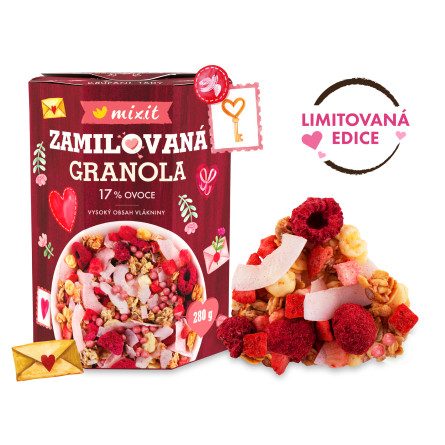 Limitovaná zamilovaná granola křupe díky cornflakes v bílé čokoládě, lyofilizovaným malinám a kokosovým chipsům. Mrazem sušené jahody v něm čarují rovnou dvakrát — jako kostky a jako kouzelný jahodový prach. A navrch crispies v bílé čokoládě s malinami.