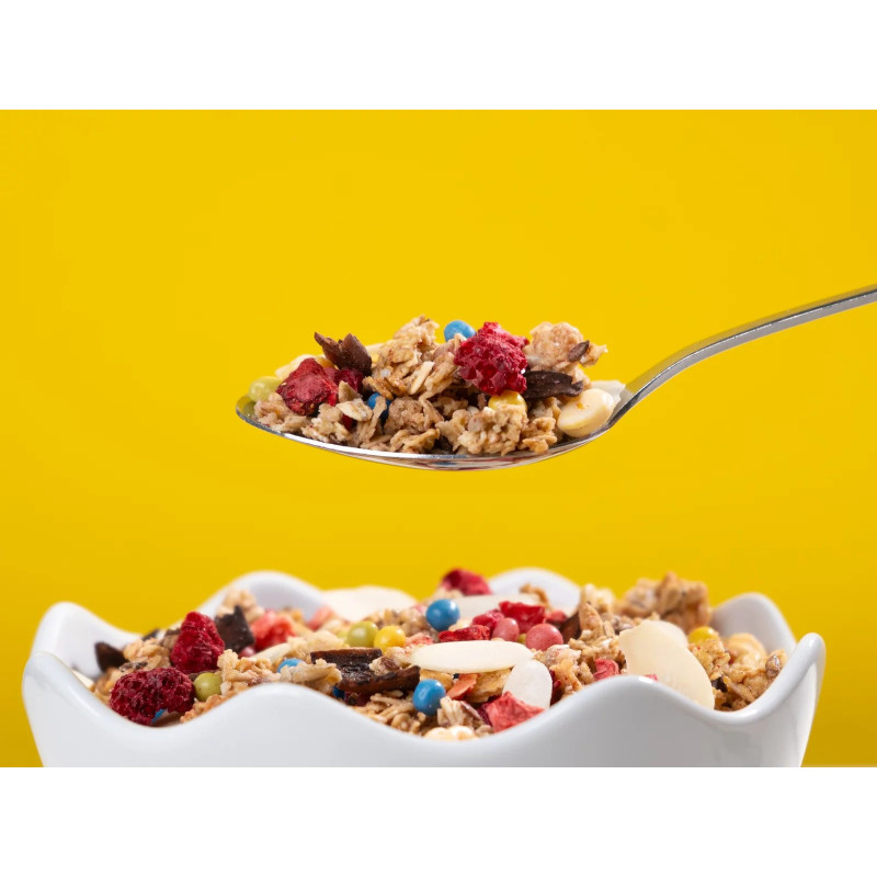 Granola 71 % (celozrnné ovesné vločky, vláknina z kořene čekanky, slunečnicová semena, lněná semena, řepkový olej), kokosové plátky s kakaem 5 % (kokosové plátky pražené 67,8 %, třtinový cukr, kakaový prášek 7,5 %, mořská sůl), plátky mandlí 4,7 %, směs barevných křupinek v bílé čokoládě 11,6 % [bílá čokoláda 69 % (cukr, kakaové máslo, sušené mléko, sušená smetana, emulgátor: lecitiny; přírodní vanilkové aroma), crispies (pšeničná mouka, cukr, jedlá sůl, kakao se sníženým obsahem tuku), prášek z mrazem sušených malin, mleté listy zeleného čaje, koncentrát spiruliny a světlice barvířské, lešticí směs (lešticí látka: arabská guma; cukr, med)], kukuřičné lupínky v bílé čokoládě 3,4 % [bílá čokoláda 56 % (cukr, kakaové máslo, sušené plnotučné mléko, sušená smetana, emulgátor: lecitiny; přírodní vanilkové aroma), kukuřičné lupínky 42 % (kukuřičná krupice, cukr, jedlá sůl, ječný sladový výtažek, minerální látka: uhličitan vápenatý), lešticí směs (lešticí látka: arabská guma; cukr, med)], lyofilizované jahody 2,1 %, lyofilizované maliny 1,7 %
