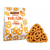 Křupavý, vypečený, jemně solený preclík obalený vrstvou bílé čokolády se slaným karamelem.