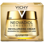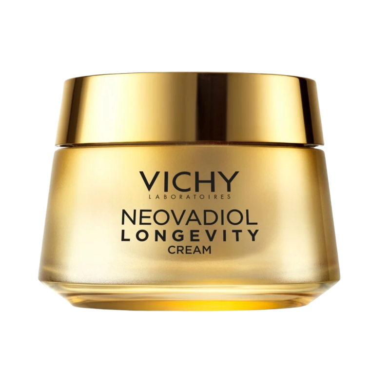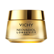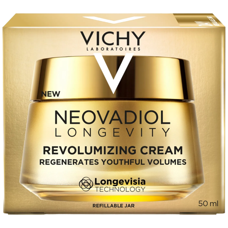 VICHY Neovadiol Longevity revitalizační krém s obsahem 13% Proxylane-Longevity Technology™ [Proxylane + Niacinamid + Senevisium®]. Průlomová technologie dlouhověkosti podložená více než 20 lety výzkumu: obnovení vlastní schopnost pokožky regenerovat +31 % mladistvé epidermální tkáně. Má výživnou texturu s hedvábným finišem.
