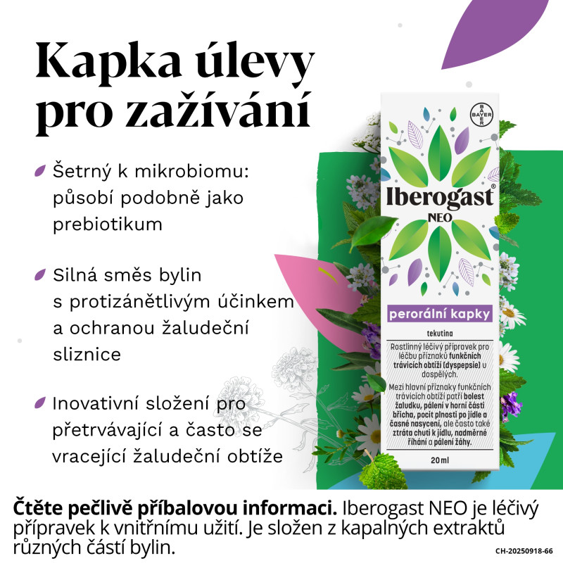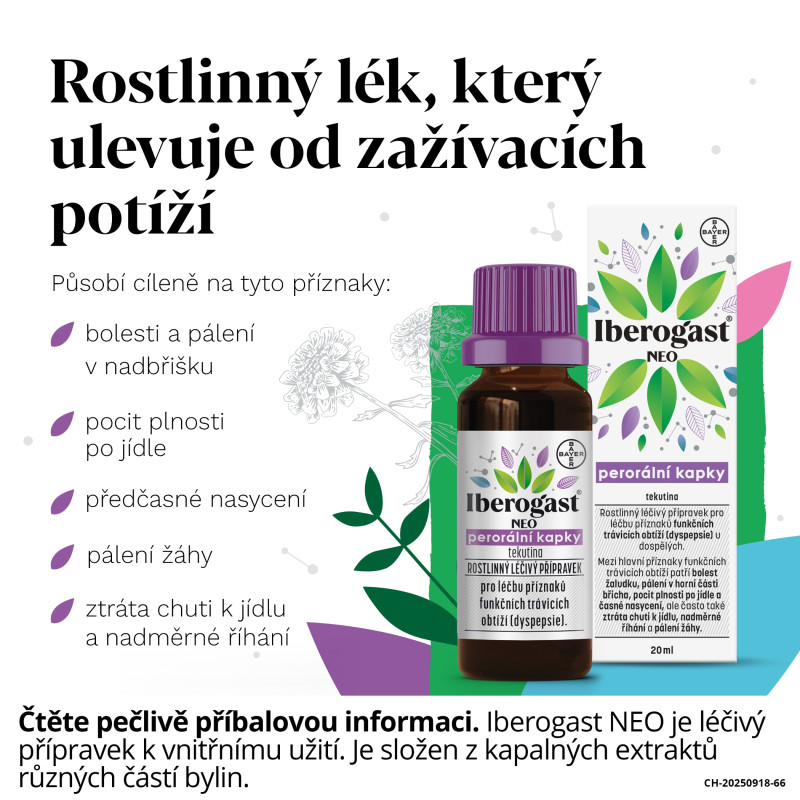 Rostlinný léčivý přípravek Iberogast NEO je tzv. fytofarmakum, které ulevuje od bolesti žaludku nebo břicha, nadýmání, nevolnosti, pocitu plnosti nebo křečí v břiše. Díky svému komplexnímu působení dokáže ulevit od několika příznaků zažívacích potíží najednou. Mezi obvyklé trávicí obtíže patří bolest a pálení v horní části břicha, pocit plnosti po jídle, předčasné nasycení, pálení žáhy, ztráta chuti k jídlu a nadměrné říhání.