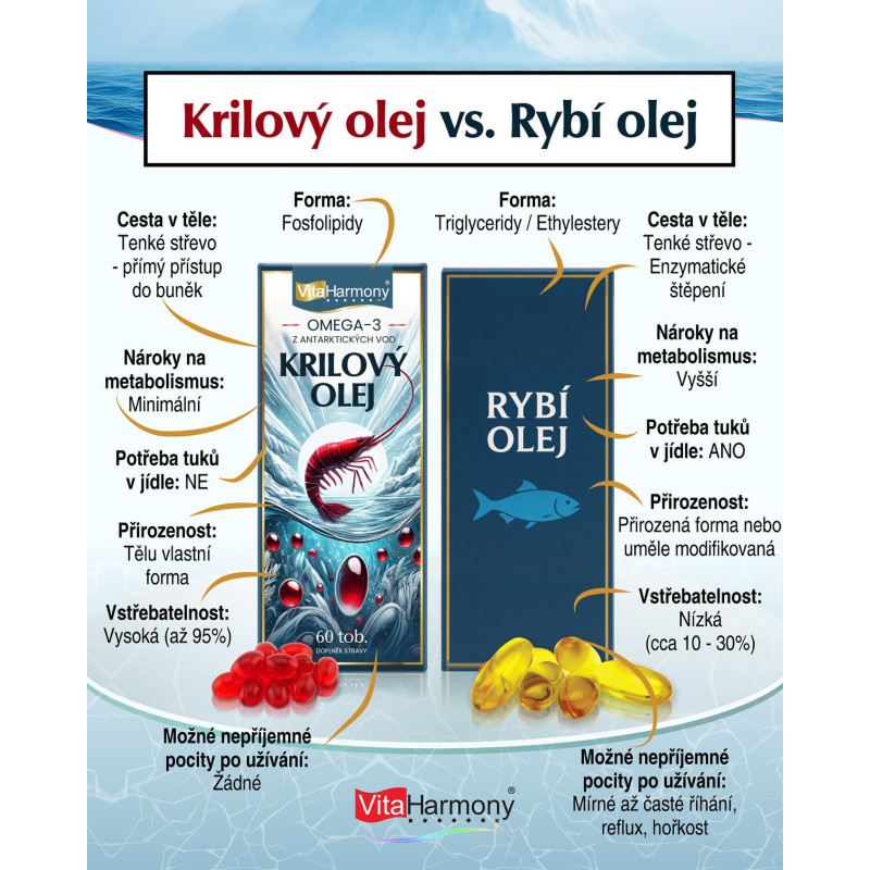 VITAHARMONY Krilový olej z antarktického korýše (Euphausia superba) představuje moderní, čistý a účinný zdroj omega-3 mastných kyselin. Na rozdíl od běžných rybích olejů jsou omega-3 kyseliny (EPA a DHA) v krilovém oleji vázány na fosfolipidy – formu, která je tělu vlastní a lépe se vstřebává do buněk. Díky tomu organismus tyto zdraví prospěšné tuky efektivněji využívá.