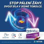 Helicid NEO je léčivý přípravek, který je speciálně vyvinutý pro rychlou a dlouhodobou úlevu pro pacienty s příznaky refluxu, zvýšené acidity a pálení žáhy. Jedinečná kombinace omeprazolu s okamžitým uvolňováním a jedlé sody pro dvojí účinek – rychlou úlevu od příznaků a dlouhotrvající ochranu žaludku přes den i v noci. To vše při užívání jedné tobolky denně.