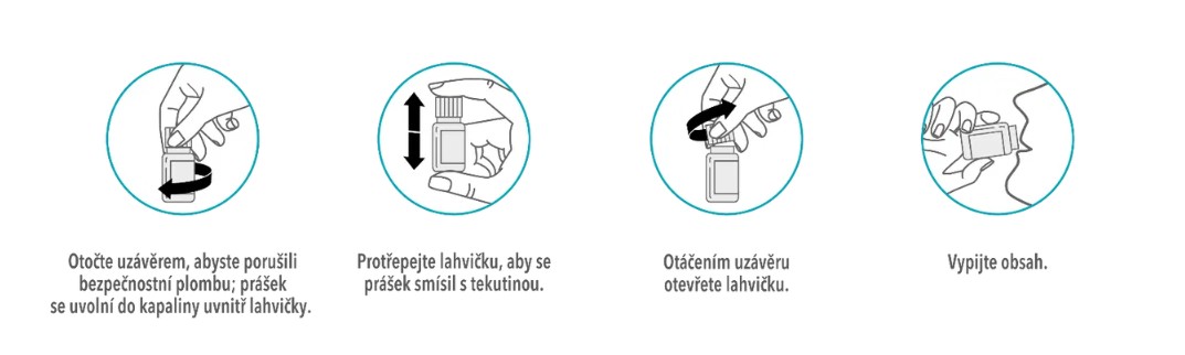 Otočte uzávěrem, aby jste porušili bezpečnostní plombu. Prášek se z víčka uvolní do kapaliny uvnitř lahvičky. Lahvičkou je nutné důkladně zatřepat, aby se promíchal prášek a roztok do homogenní suspenze. Poté se víčko odšroubuje a lahvička se otevře.