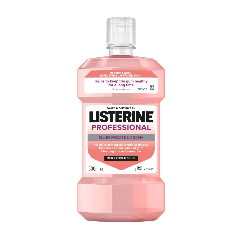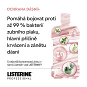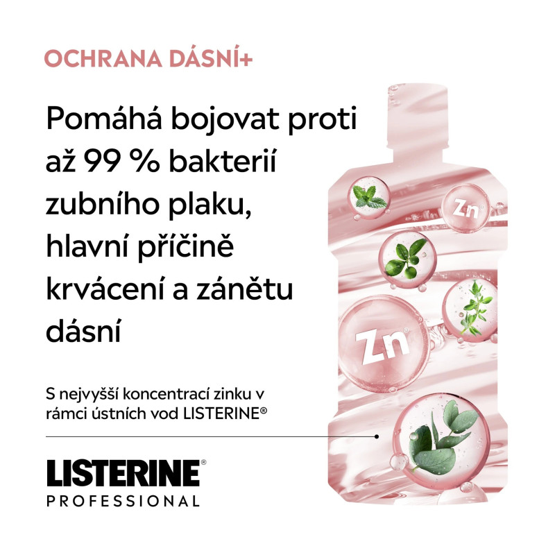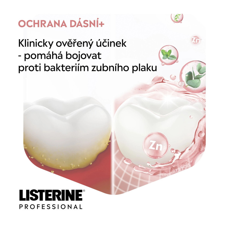 Ústní voda LISTERINE® PROFESSIONAL GUM PROTECTION+ s esenciálními oleji, fluoridem a nejvyšším obsahem zinku v rámci ústních vod LISTERINE® pomáhá bojovat proti zubnímu plaku, hlavní příčině krvácení a zánětu dásní, při používání 2x denně.