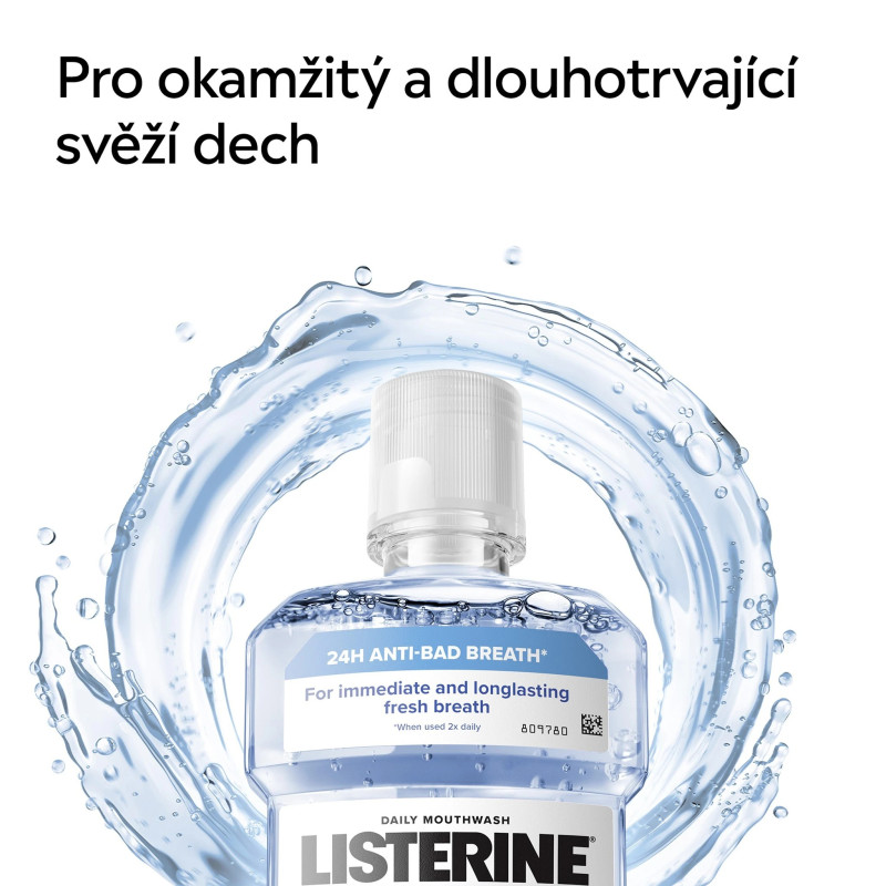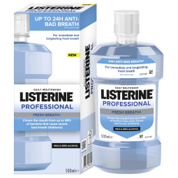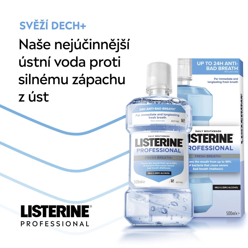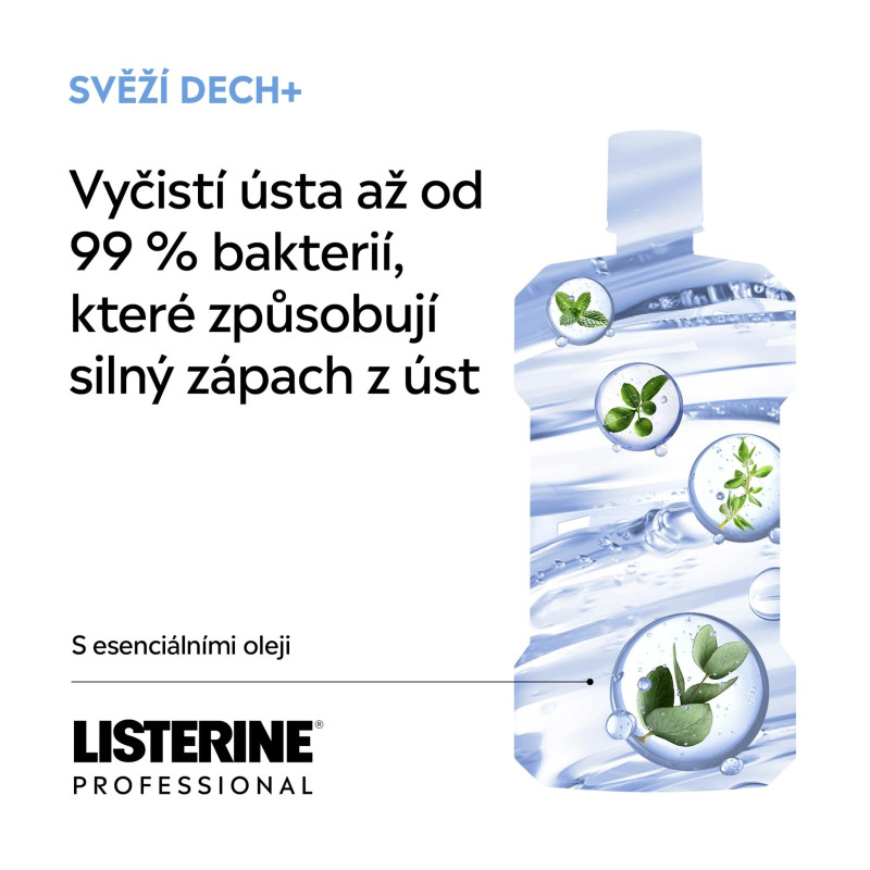 Ústní voda LISTERINE® PROFESSIONAL FRESH BREATH+ s esenciálními oleji, zinkem a technologií neutralizující zápach při používání 2x denně čistí ústa od bakterií, které způsobují silný zápach z úst (halitózu).