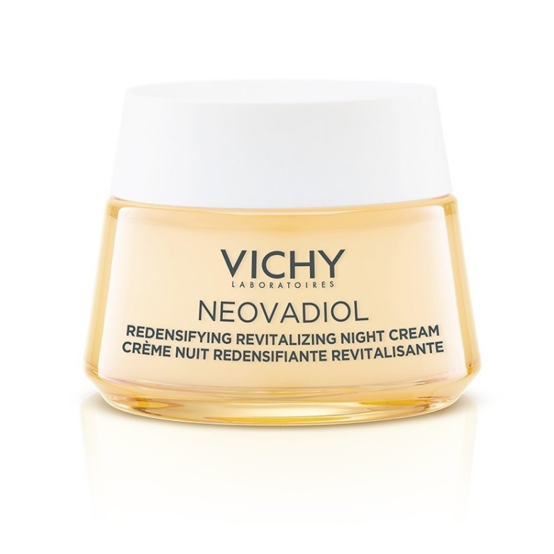 VICHY NEOVADIOL Noční krém pro období perimenopauzy. Vyplňující revitalizační noční krém. Hormonální změny v období kolem menopauzy urychlují stárnutí pleti, která ztrácí elasticitu a hutnost. Kontury jsou méně vyrýsované. Návaly horka mohou způsobovat nepříjemné pocity na pleti. Laboratoře Vichy vyvinuly lehký, osvěžující noční krém s obsahem Termální vody Vichy vulkanického původu obohacené o 15 minerálů, Proxylanu, výtažku z kasie a kyseliny hyaluronové. Okamžitě ochlazuje pleť až o 2,7 °C*, zlepšuje hutnost pleti a vyhlazuje kontury. *Instrumentální test: 24 žen - 45 vteřin po aplikaci.