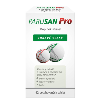 PARUSAN Pro zdravé vlasy přestavuje vyváženou kombinaci aktivních látek – vitaminů, minerálů a bylinných extraktů a dalších živin, které pomáhají příznivě ovlivnit stav vlasů, nehtů a pokožky. Obsahuje přírodní výtažky z přesličky rolní a kopřivy, které se v tradiční péči o vlasy a pokožku používají již po staletí. Přípravek má vysoký obsah biotinu, často nazývaného „vitamin krásy“. Biotin přispívá ke krásnému vzhledu vlasů a pokožky. Doplněk stravy také obsahuje vitaminy: A, B2, B6, B1, B5 a vitamin C. Vitamin C přispívá ke správné tvorbě kolagenu pro normální funkci pokožky. Dalšími nutrienty jsou L-methionin, kyselina para-aminobenzoová (PABA) a zinek. Zinek přispívá k udržování normálního stavu vlasů, nehtů a pokožky.