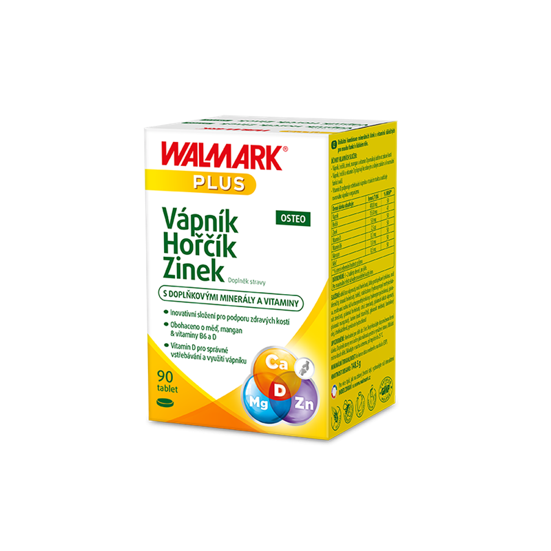 Unikátní kombinace minerálních látek a vitaminů důležitých pro mnoho funkcí v lidském těle.nÚčinky hlavních složek:n* Vápník, hořčík, zinek, mangan a vitamin D pomáhají udržovat zdravé kosti n*Vápník, hořčík a vitamin D přispívají ke zdravým a silným zubům a k normální funkci svalů n* Mangan přispívá k normální tvorbě pojivových tkání, jako jsou šlachy a vazy n* Vitamin D podporuje vstřebávání vápníku v trávicím traktu a udržuje rovnováhu vápníku v organizmun* Zinek přispívá k udržování zdravé kůže, vlasů a nehtůn* Zinek, mangan a měď přispívají k ochraně buněk před oxidativním stresemn* Měď přispívá k normální pigmentaci vlasů a kůže n* Zinek, měď a vitaminy D a B6 jsou důležité pro normální funkci imunitního systémunWalmark Vápník Hořčík Zinek OSTEO :n* Složení prémiové kvality s vyváženou kombinací minerálů a vitaminůn* Vápník a hořčík v optimálním poměru n* Obohaceno o vitamin D, který přispívá ke správné absorpci vápníku a fosforun* Vhodný zejména pro seniory, osoby dlouhodobě upoutané na lůžko nebo v průběhu rekonvalescencen* Doporučeno ženám v období těhotenství, kojení nebo menopauzyn* Prospěšný v obdobích zvýšené tělesné aktivityn* Vyrobeno držitelem certifikátu GMP