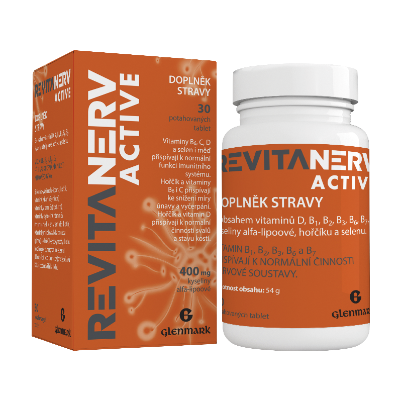 Revitanerv Active je doplněk stravy s obsahem 100% denní dávky vitaminů C a D, mědi a selenu pro správnou funkci imunitního systému. V 1 tabletě je také 400 mg kyseliny alfa-lipoové. Obsahuje vitaminy skupiny B (B1, B2,B3, B6, B7, B12), které jsou důležité pro správnou činnost nervové soustavy.