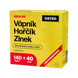 Doplněk stravy Walmark vápník - hořčík - zinek OSTEO je multiminerálový přípravek s vitamínem D3 a B6. Jedná se o přípravek prémiové kvality s vyváženou kombinací minerálů a vitamínů. Prospěšný v obdobích zvýšené tělesné aktivity. Vhodný pro seniory nebo osoby dlouhodobě upoutané na lůžko. Vitamín B6 přispívá k normální činnosti imunitního systému. Vitamín D3 přispívá k udržení normálního stavu kostí. Zinek přispívá k ochraně buněk před oxidativním stresem a k udržení normálního stavu vlasů. Mangan přispívá k normálnímu stavu kostí. Měď přispívá k normální činnosti nervové soustavy. Hořčík přispívá k normální činnosti svalů a nervové soustavy. Vápník přispívá k udržení normálního stavu kostí.