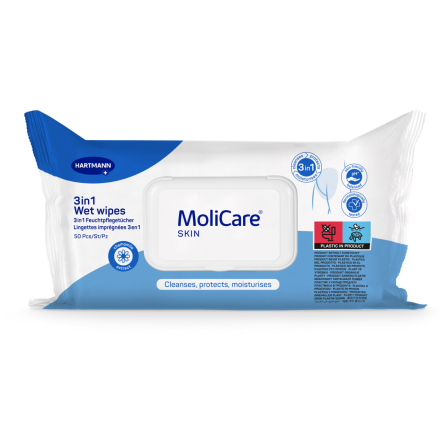 Vlhčené ubrousky MoliCare Skin 3v1 nabízejí hned 3 klíčové vlastnosti: čistí, chrání a hydratují namáhanou pokožku. Jsou vhodné pro čištění celého těla jejich složení je vhodné pro citlivou a podrážděnou pokožku. Používají se při každé výměně inkontinenční pomůcky. Zachovávají přirozeně kyselý ochranný plášť pokožky. Pro osoby s rizikem IAD a mírnými formami IAD doporučují odborníci na péči čištění pH neutrálními přípravky bez vody.